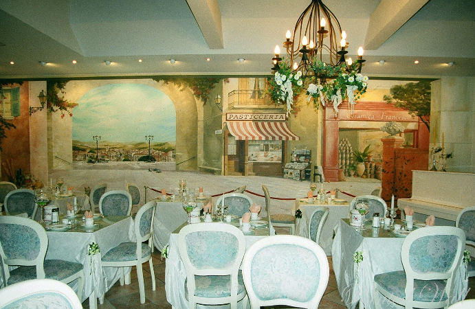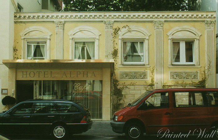 The Hotel Alpha is situated in the centre of Hannover. On the occasion of the Expo 2000, a reconstruction and new building took place. The comparatively small extension got a facade painting and thus turned into an Italian villa. In the breakfast orangery a piazza was created by illusionistic painting.
