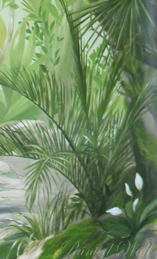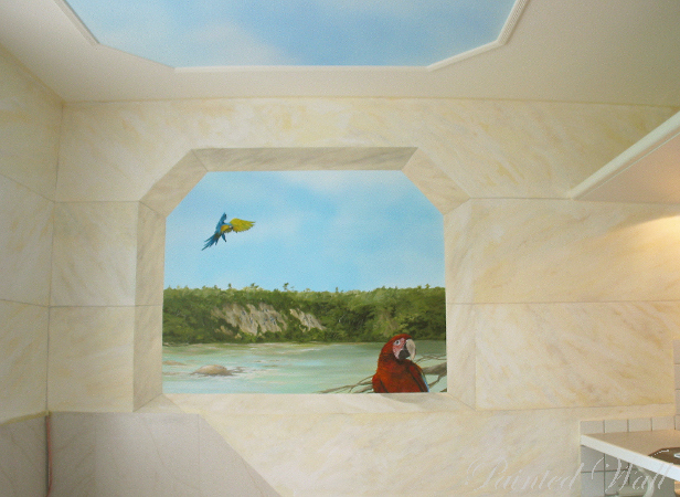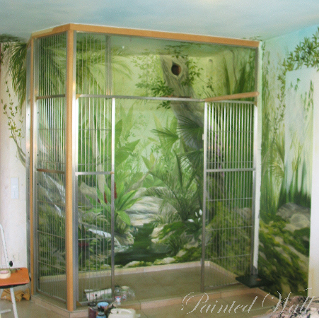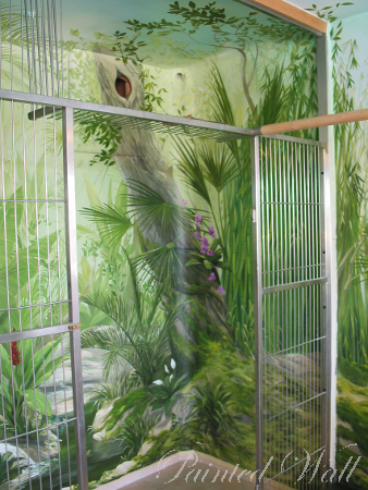 A parrot lover had a part of his house decorated with an illusionistic painting for his feathered darlings. The painting shows the Amazon area.
