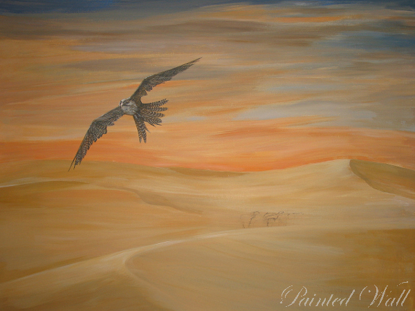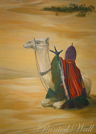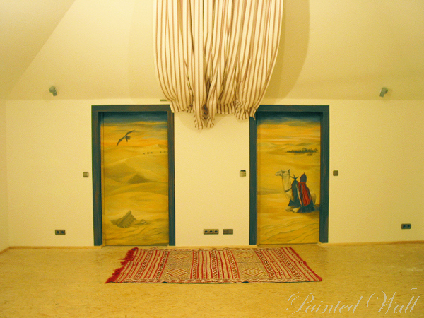 This room in the attic of a castle is supposed to convey the feeling of the inside of a bedouin tent. The trompe l'oeil-painting opens a view of the desert.