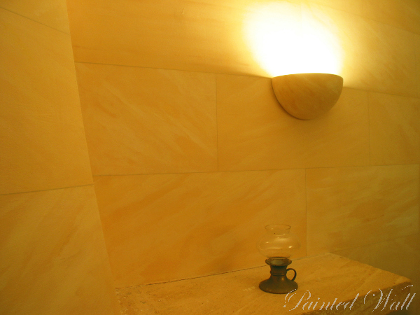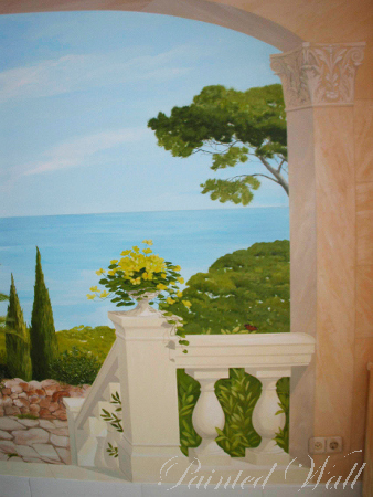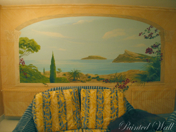 In a Majorcan villa, a wall painting in the salon creates a particularly cheerful atmosphere. The terra shade of the natural stones was picked up in the painting of the stones on the walls. Bougainvilleas frame the view of the sea from the terrace.