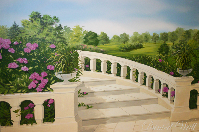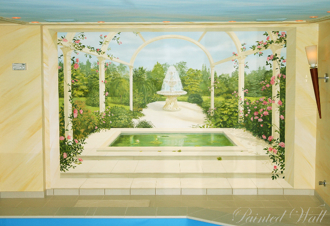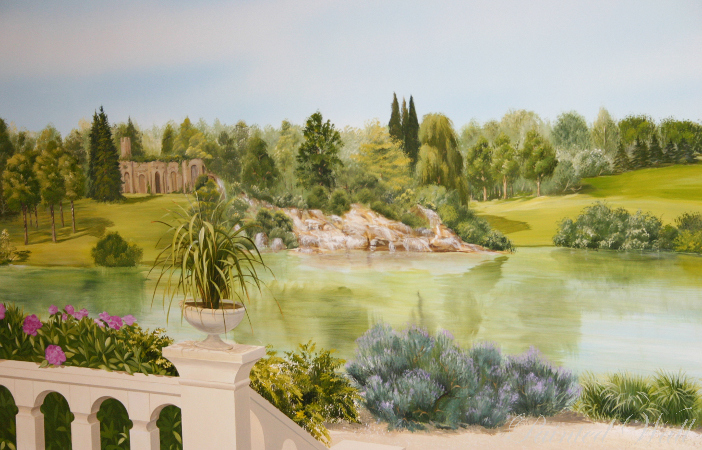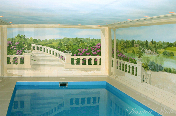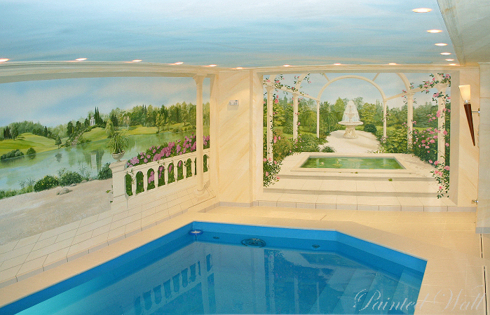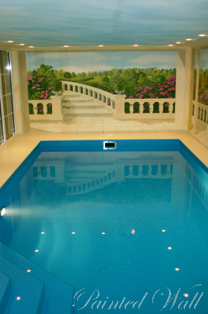 This rather small swimming pool fascinates through the effect of the wall painting as a means to open up the space. The owners asked for a European parc landscape with architecture, a well, a small church ruin and a pavillon in the far distance. The arc of the big staircase at the front of the swimming pool accompanies the viewer down into the depth of the parc which then leads into the lakeland region. Big rhododendron blossoms stand magnificently in front of the landscape's many and diverse shades of green.