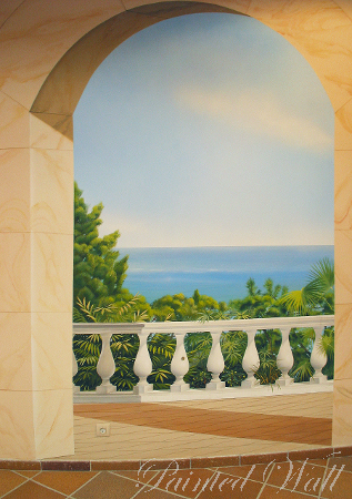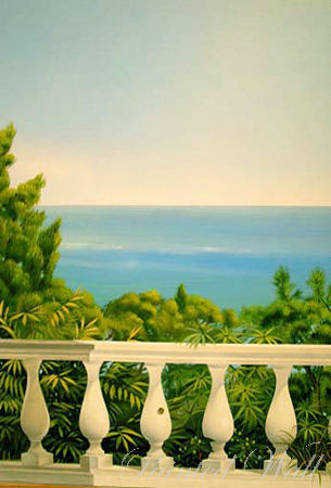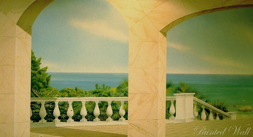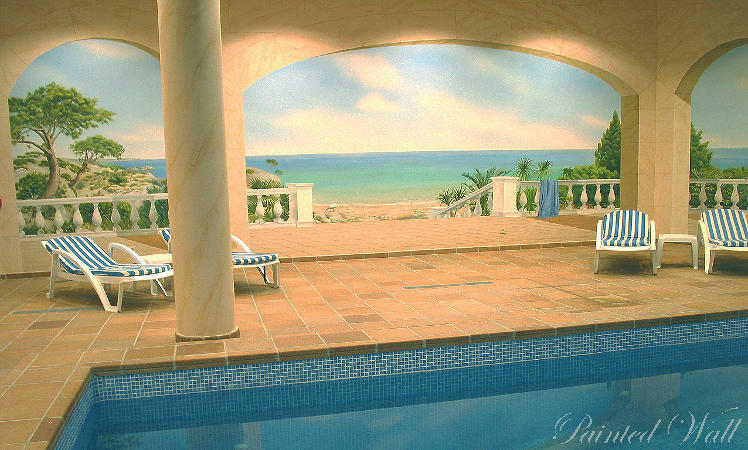 Even on a sunny island an indoor swimming pool for cooler days must not be missing. A large, comprehensive swimming pool decoration with wall painting was decided. Our illusionistic painting shows the "Costa de Blanes" 50 years ago when things were still a little more peaceful on Majorca. The painted marble belongs to the wall painting, too.