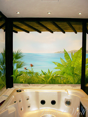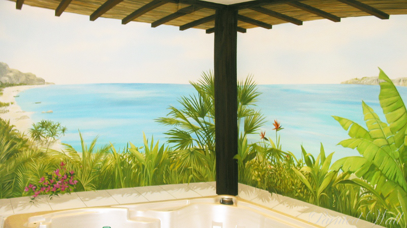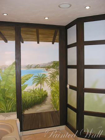 An unforgettable holiday on Kho-Pi-Pi Island has been our customers' inspiration for an illusionistic painting like this in their wellness area. A special attraction in this wall painting is the painted glass wall. It makes one sense a wide natural landscape behind it. The wooden construction is also painted.